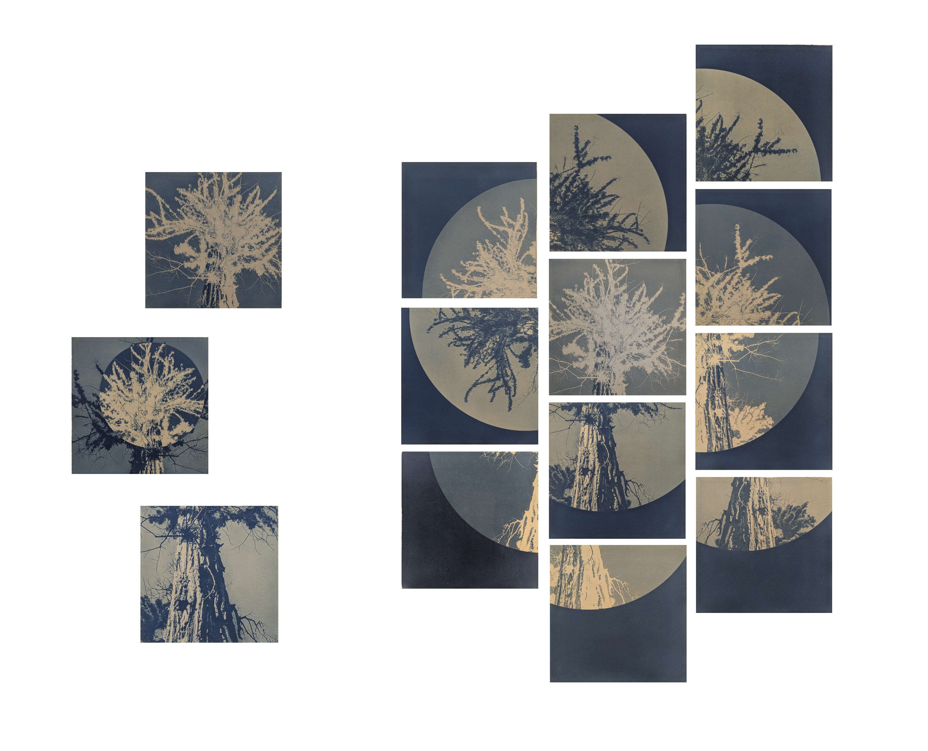 Mother Tree Reimagined, fourteen 8 x 8" cyanotypes toned in redwood bark tannin solution, will be on exhibit in addition to a selection of artworks from the series Heart(h) and Canopy Constellations.